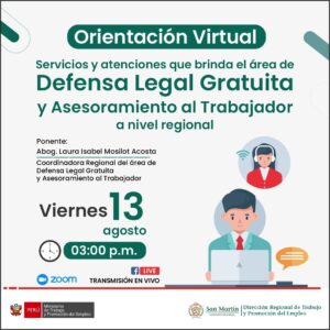 ✅ La Dirección Regional de Trabajo y Promoción del Empleo te invita a participar de la Orientación Virtual: «Servicios y atenciones que brinda el área de Defensa Legal Gratuita y Asesoramiento al Trabajador a nivel regional»